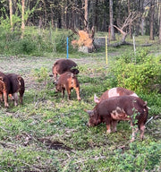Our regeneratively raised pork comes from pigs that live the way nature intended — outside in the trees, with fresh air, sunshine, and space to roam. No barns, no stress, no shortcuts.